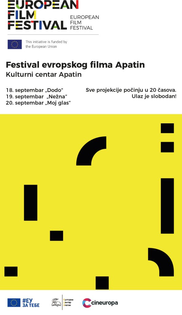 festivala i mi postajemo prepoznatljiv deo evropske i svetske kulturne baštine. Evropski filmovi, iako često u senci holivudskih blokbastera, zrače jedinstvenim kvalitetom i umetničkom vizijom koja prevazilazi granice evropskog kontinenta. Sada – na početku filmske sezone, Opštinski kulturni centar Apatin pruža priliku svim ljubiteljima filmske umetnosti da u našem, apatinskom bioskopu, pogledaju sveža filmska ostvarenja evropske i svetske kinematografije.