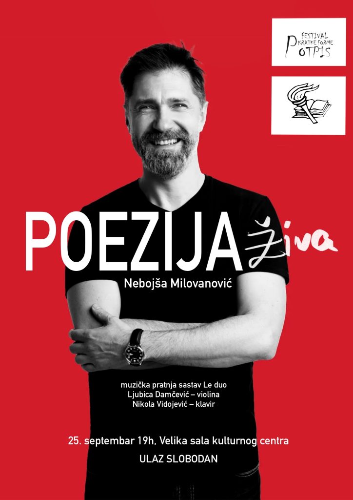Drugog dana Festivala kratke forme “Potpis”, 25. septembra od 19 časova u Velikoj sali Kulturnog centra imaćemo priliku da uživamo u muzičko-poetskoj večeri. Poezija živa je poetski monodramski kolaž sastavljen od poezije velikana literature sa temama ljubavi, života, smrti, obogaćena snagom klasične muzike koju na sceni izvode violina i klavir.